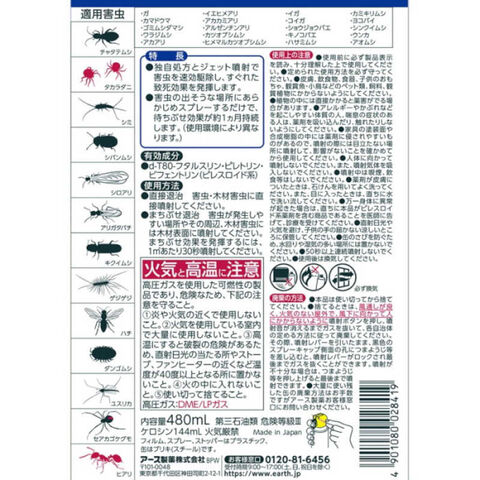 仕様3:使用方法直接退治:害虫・木材害虫に直接噴射してくださいまちぶせ退治:害虫が発生しやすい場所やその周辺、木材害虫には木材表面に噴射してくださいまちぶせ効果を発揮するには、1㎡あたり30秒噴射してください