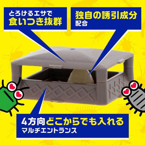 仕様3:使用方法●1個ずつ切り離して、庭先、玄関、窓際のような家まわりで、虫が侵入してきたことがある場所、またはよく見かける場所に2mあたり1個、壁に沿わせて置いてください※ムカデが侵入しそうな場所には、両側からはさむように容器を設置すると効果的です●屋外、屋内、両方でお使いいただけます●必ず水平に置くこと※虫が食べやすいようにエサが液状になります
