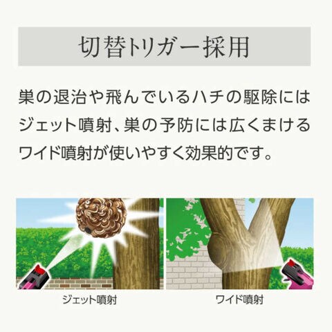 巣の退治と飛び回るハチはジェット噴射、巣作り予防はワイド噴射と切替が可能