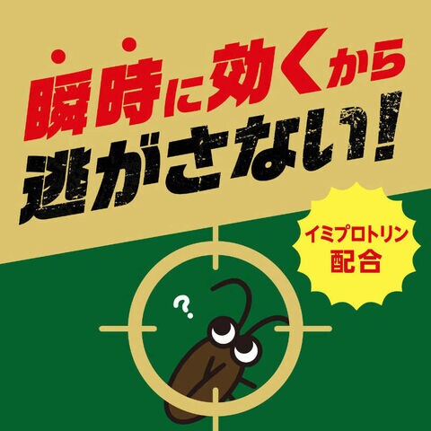 有効成分イミプロトリンの速効効果でゴキブリを秒速ノックダウンさせ、逃げる余裕を与えず駆除します。すき間用ノズル付。