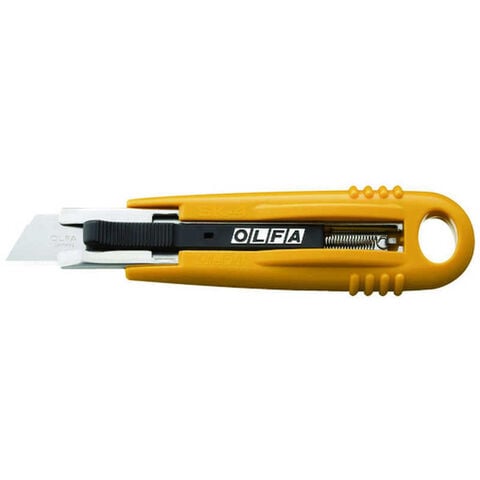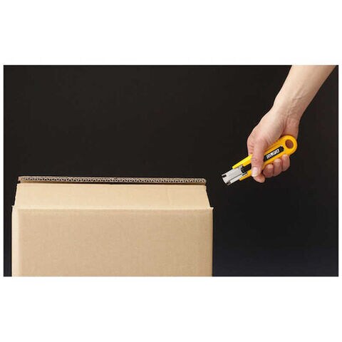 ●スプリングで刃が自動的に戻る、安全性の高い開梱用カッターです。