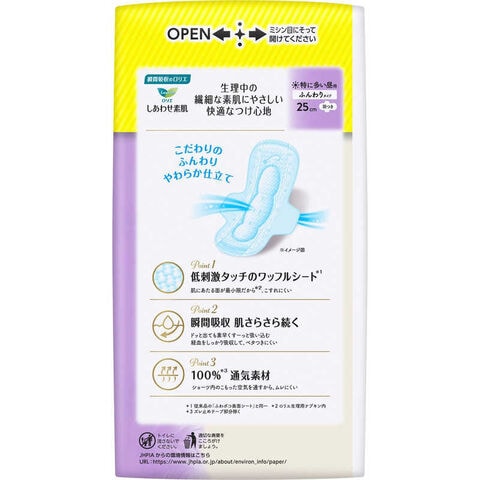 お徳な大容量タイプ。瞬間吸収のロリエ。生理中の繊細な素肌にやさしいつけ心地。