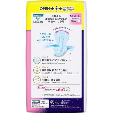 お徳な大容量タイプ。瞬間吸収のロリエ。生理中の繊細な素肌にやさしいつけ心地。