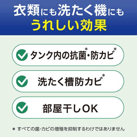 ●タンク内の抗菌・防カビ※3●洗たく槽の防カビ※3●部屋干しOK※1ハミング消臭実感比※2水量30Lで、毎日1回洗たくする場合300ml全量入るタンクのとき※3すべての菌・カビの増殖を抑制するわけではありません