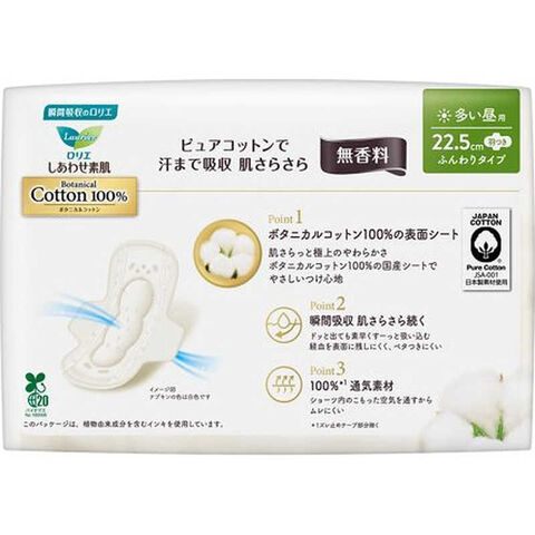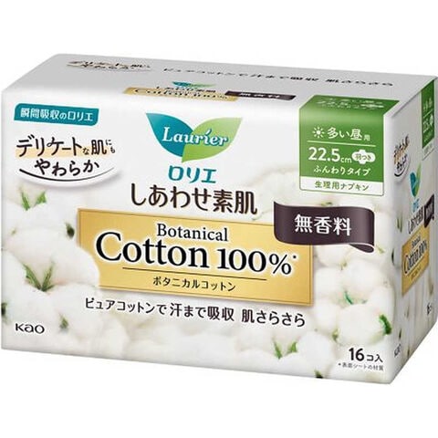 花王 Laurier(ロリエ)しあわせ素肌 Botanical Cotton100% 多い昼用 22.5cm 羽つき 無香料 16個