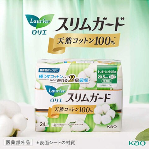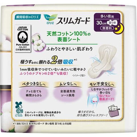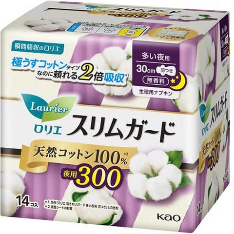 花王 Laurier(ロリエ) スリムガード 天然コットン100% 多い夜用300 30cm 羽つき 無香料 14個