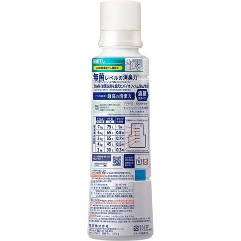 成分:界面活性剤[47%、高級アルコール系(非イオン)、高級アルコール系(陰イオン)、ヒドロキシアルカンスルホン酸塩]、安定化剤、抗菌剤、消臭助剤、酵素