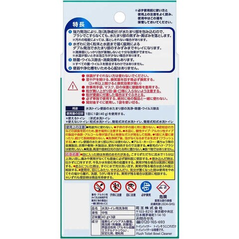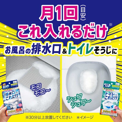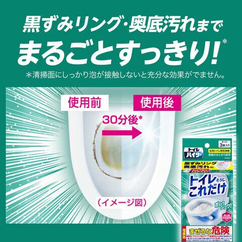 水ぎわに効く粉末と水底まで届く錠剤、ダブル発泡でトイレの水ぎわ・水底の汚れを落とせる強力発泡洗浄剤。