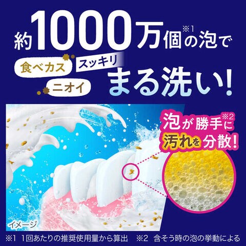 洗浄剤(無水ピロリン酸Na)がお口まるごと浄化(医薬部外品)※1:1回あたりの推奨使用量から算出 ※2:食べ物由来のタンパク質や脂質、水分等の混合物