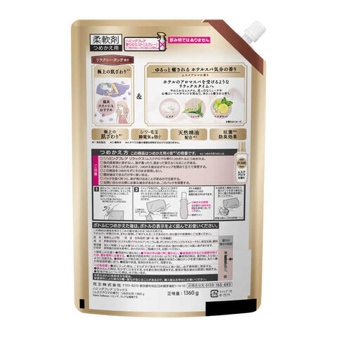 ゆるっと癒される ホテルスパ気分へ ムスクアロマの香り ホテルのアロマスパを受けているようなリラックスタイムへ やわらかなムスクに、真っ白なミューゲや心地よいベルガモットを重ねたゆるっと癒される香り 極上の肌ざわり※1 ※1当社品比 リラクシータッチ処方 ・シワ・毛玉・静電気を防ぐ ・天然精油配合※2 ※2香料中 ・抗菌※3防臭効果 ※3すべての菌の増殖を抑制するわけではありません