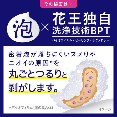 泡の力で、こすらず勝手にキュッ*!わずか5分で、ヌメリ・ニオイ・着色汚れを除去し99.9%除菌※!花王独自洗浄技術BPT(バイオフィルム・ピーリング・テクノロジー)を搭載し、密着泡が落ちにくい汚れを丸ごとつるりと剥がします。