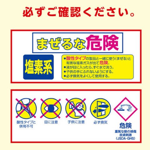 ●酸性タイプの製品と一緒に使う(まぜる)と有害な塩素ガスが出て危険。