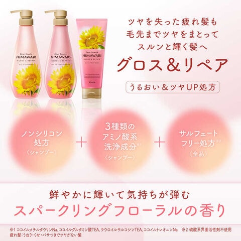 ●補修&保湿成分「プレミアムヒマワリオイルEX(オーガニックヒマワリオイル、ヒマワリ種子エキス、ヒマワリ花エキス)」配合。髪内部にうるおいをあたえ、髪の外側のキューティクルのはがれをコートします。