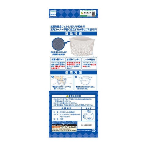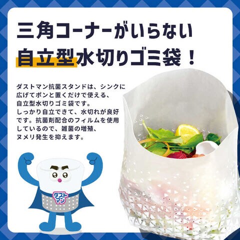 ●抗菌剤配合フィルムでヌメリ知らずの自立型水切りゴミ袋です。
