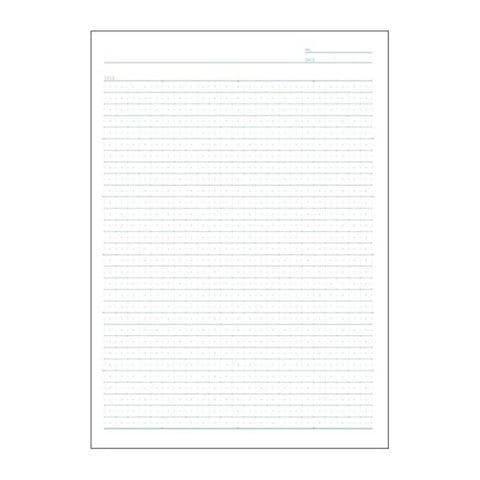 行の中心に置かれた(プラス)、横線に置かれた(メモリ)、上下に走る「点線」からなる罫線。