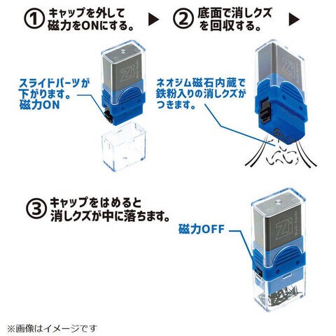 ・フェライト(鉄粉)入りの消しゴムで、消しクズが磁石で集められます・消しクズキャップを外すとケース底に内蔵のネオジム磁石が自動的に下がり、消しクズが回収できます