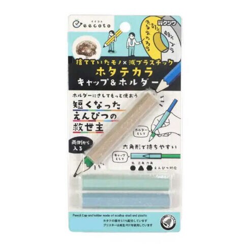 短くなった鉛筆の救世主!捨てていたモノ(帆立殻、卵殻、紙粉)を再利用してプラスチック使用量を減らしました。筒状になっていて、鉛筆を両側から挿せます。六角軸で持ちやすく、三角・丸・六角の鉛筆に使えます。