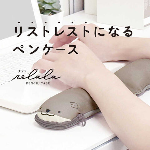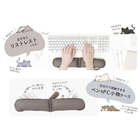 ・広げるとリストレストになるペンケース。イヤホンやタッチペン、USBなどを筆記具と仕分けて収納できます。中綿入りで手首の負担をやわらげます。ふわふわの引き手ストラップ付。