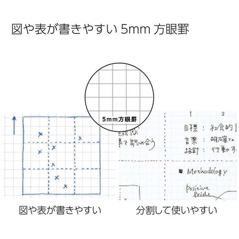 ●罫線には上下左右中央に目印がついているので、ノートを分割して使う時に便利です。
