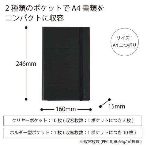 ●収容枚数(1ポケットにつき):ホルダー型ポケット/10枚、クリヤーポケット/2枚(PPC用紙64g/平方メートル換算)