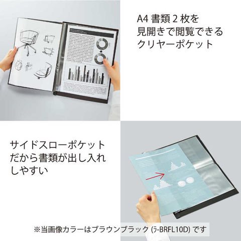 ●「サイドスローポケット」:上から入れるタイプのポケットに比べて書類の出し入れがしやすい、横から入れられるクリヤーポケット。パラパラめくって閲覧したい書類に。