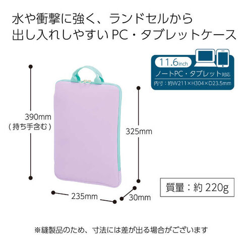 仕様1:[ノートPC・タブレットPC対応サイズ]11.6インチ[収容可能サイズ目安]内寸法:約W211xD23.5xH304mm[外寸法] W235xD30xH390mm(持ち手を含む) W235xD30xH325mm(持ち手を除く)[質量]約220g[材質]表層生地:ポリエステル、中間層:SBR、内装生地:ポリエステル、持ち手:PP