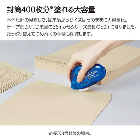 ●封筒約400枚分※塗れる、シリーズ最長テープのり(※長形3号封筒の場合)。大容量なのでたっぷり使うことができ、つめ替えの頻度も減ります。