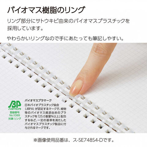 仕様1:紙質/中紙:上質紙、表紙:板紙、リング:オレフィン系樹脂バイオマスプラスチック度95%
