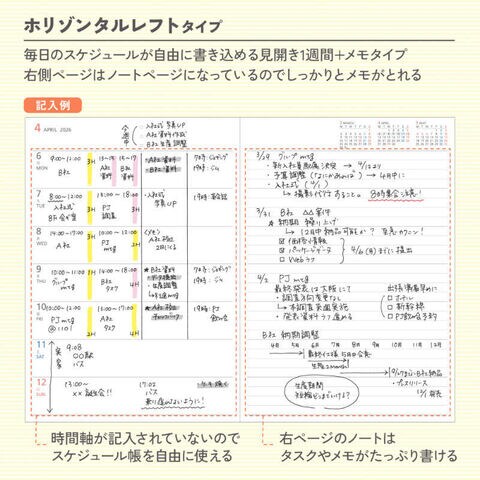 ●毎日のスケジュールが自由に書き込める見開き1週間+メモ。