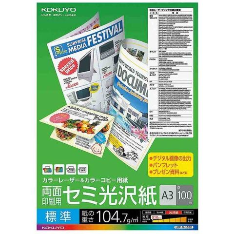 ●カラーレーザー、カラーコピー専用で紙のぎらつきをおさえ、セミ光沢の品位ある適度なツヤがあります。印刷文字も読みやすいタイプなので、活用の幅が広がります(オフセット印刷用コート紙の表面と同程度のツヤです)