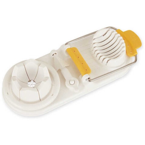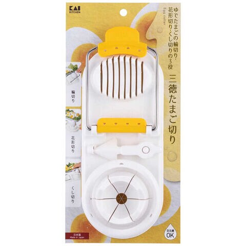 ●ゆでたまごの輪切り、花形切り、6等分のくし型切りがきれいにできる、1台3役のたまご切りです。