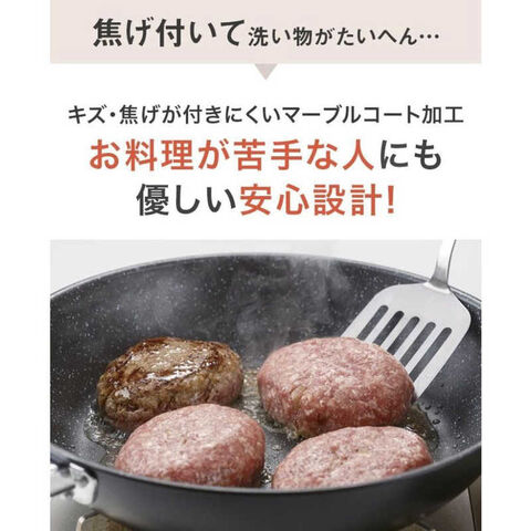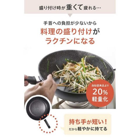 薄い側面はフライパン全体に素早く熱が回り、厚い底面が保温性を高めるので「時短」調理にも一役買う機能性フライパンです。