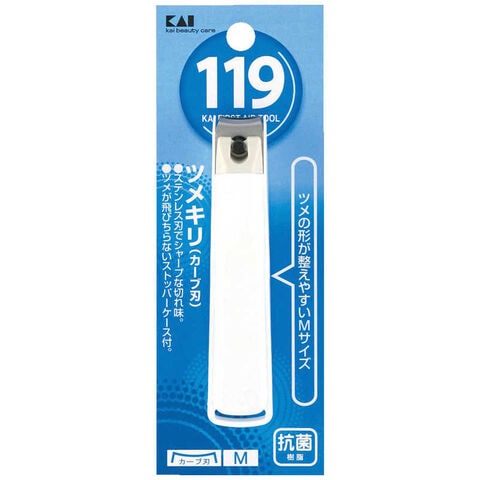 日々のお手入れをはじめ、身だしなみを整える貝印の衛生用品「119」シリーズ。ステンレス刃でシャープな切れ味のツメキリ。爪が飛び散らないストッパー付。形が整えやすいMサイズ。