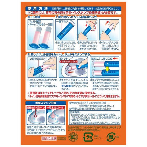 2.便器へ押し当てる: キャップをはずし、ジェル容器の先端を、便器内側の平らな面にピッタリと押し当てる。