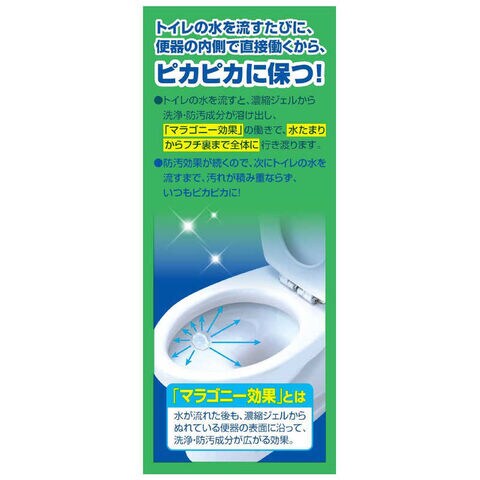 流す度に便器の内側全体に洗浄防汚成分が行き渡り、漂白効果も!