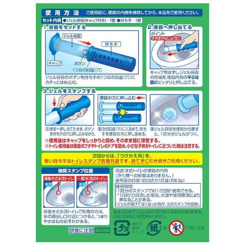 2.便器へ押し当てる: キャップをはずし、ジェル容器の先端を、便器内側の平らな面にピッタリと押し当てる。
