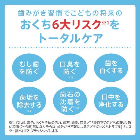 1.むし歯を含め、今後気になりそうなお子さまのおくち6大リスク※1を歯みがき習慣でトータルケアします。