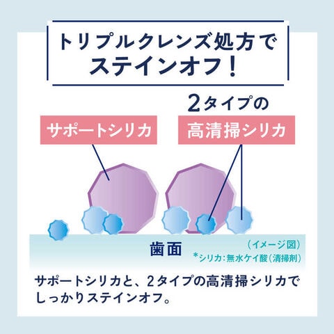 ●大きいサイズのサポートシリカ(清掃剤: 無水ケイ酸)と、小さいサイズの2タイプの高清掃シリカ(清掃剤: 無水ケイ酸)で、しっかりステインを除去する「トリプルクレンズ処方」を採用しています。