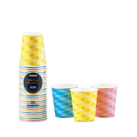 ピンク・イエロー・ブルーの3柄アソートの紙コップで使い分けにも大変便利です。