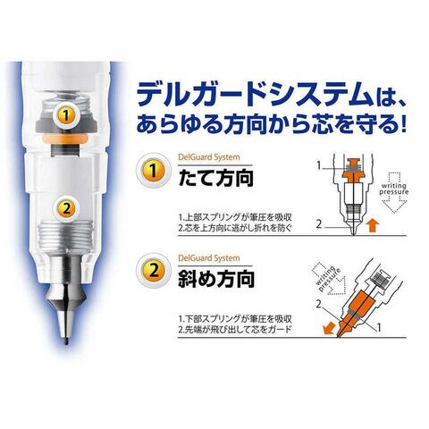 紙面に対し、垂直に強い筆圧が加わると、軸に内蔵されたスプリングが芯を上方向に逃し折れを防ぎます。