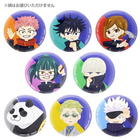 呪術廻戦デザインの缶バッチ。虎杖悠仁、伏黒恵、釘崎野薔薇、禪院真希、狗巻棘、パンダと五条悟、そして七海建人がクローズドパッケージで入っています。注意: デザイン・柄はお選びいただけません。