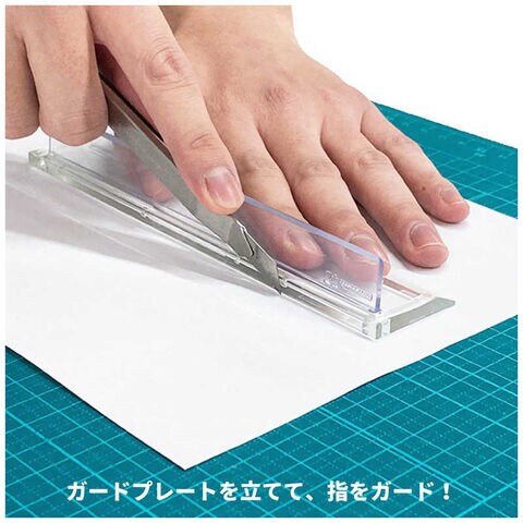 切る際にガードプレートを立てることで指を守れて安全にカッターで切ることができます。さらに裏面には細かいマット加工が施されており、滑り止め効果が期待できます。