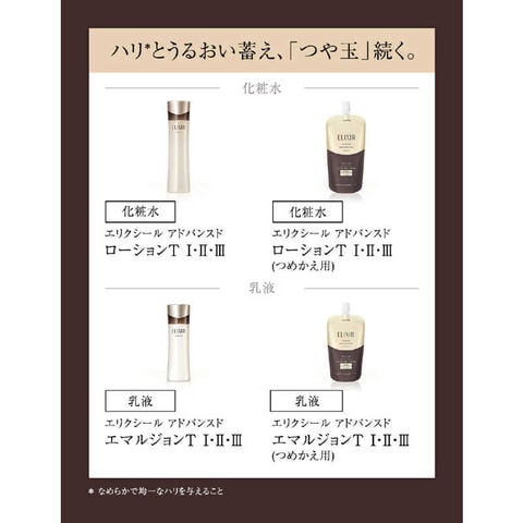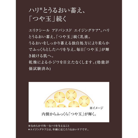 エリクシール アドバンスド エイジングケア*。ハリとうるおい蓄え、「つや玉」続く乳液。