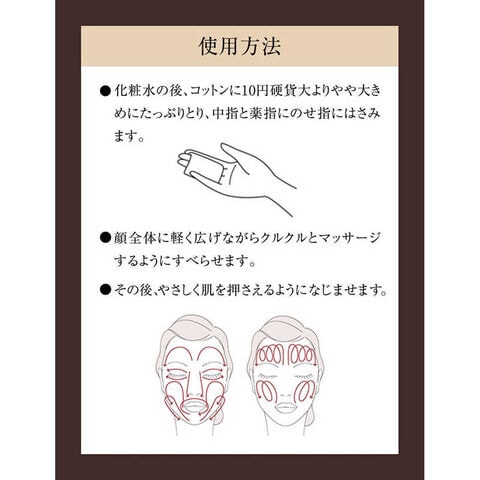 ●化粧水の後、コットンに10円硬貨大よりやや大きめにたっぷりとり、顔全体に軽く広げながらクルクルとマッサージするようにすべらせます。その後、やさしく肌を押さえるようになじませます。<詰め替え方>(1)キャップと中栓つきのキャップをはずしておく。 (2)そそぎ口のつけ根部分をしっかりおさえながらキャップをはずす。 (3)そそぎ口を本体容器の口にしっかり差し込み、そのままゆっくり中味を入れる。 (4)印が合うところまできちんと閉める。