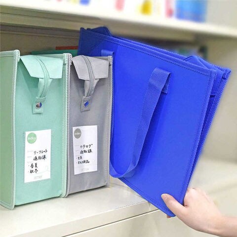 収納物表示用透明ポケット付き・自立するので、どこにでも置くことができる。