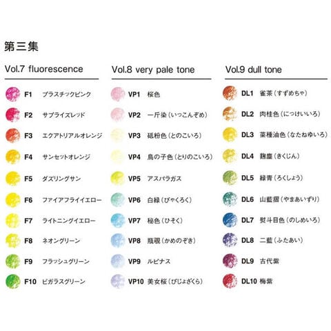 つややかな蛍光色を加えた第3集。サンセットオレンジ、ビガラスグリーンなど、光のかけらから生まれた蛍光色を含めた30色。