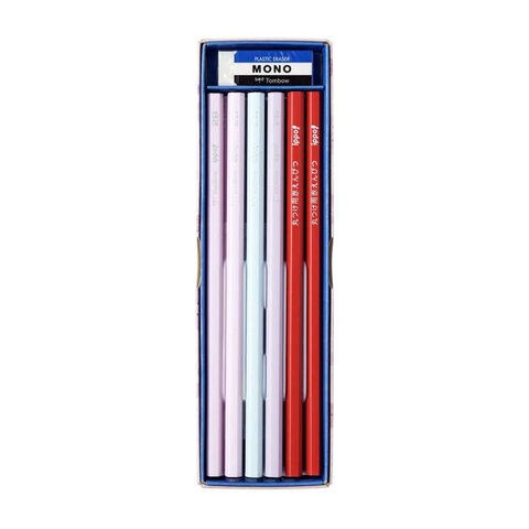 ●かきかた鉛筆(6角軸・2B)10本、丸つけ用赤鉛筆(6角軸)2本、消しゴム2個のセット。