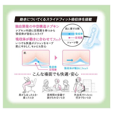 ●独自開発の中空構造ナプキン。ナプキン内部に空間層を持つから吸収体が自在にスライド。