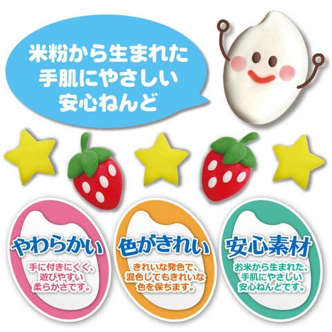 こめっこねんど6個(6色各35.0g入)計量カップ1個 ねんどヘラ1個 ねんどシート1枚主成分に米粉を使用しており、アレルギーを誘発しやすい7大アレルゲン(卵・牛乳・小麦・落花生・えび・かに)をふくんでいません。