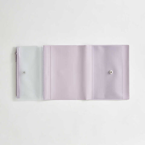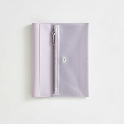 前面ポケットはお気に入りのポストカードなどを入れて表紙をカスタムできるクリア素材。